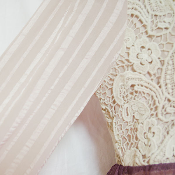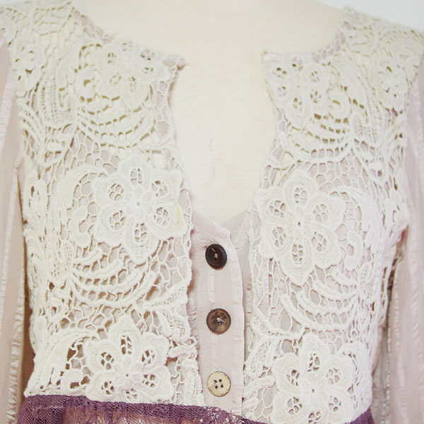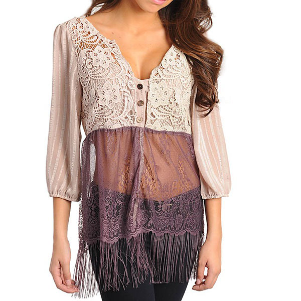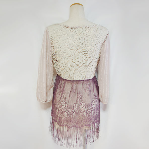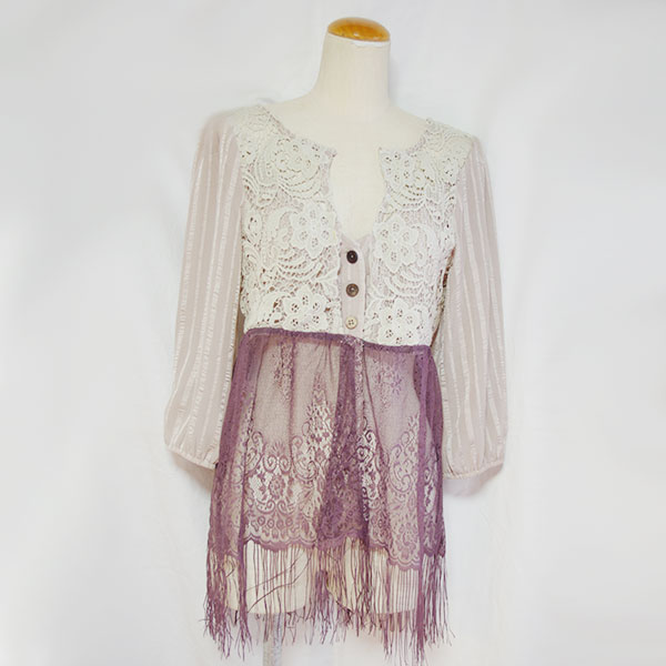 LAからシフォンのレーストップスです。7分丈で、ベージュとパープルで大人な印象のレーストップスです。裾はフリンジになっていています。